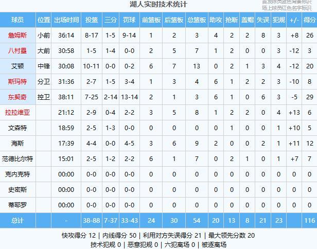 东契奇29分3板6助、詹姆斯26分3板4助2断2帽、艾顿20分13板2断、海斯12分9板2助、斯玛特8分4板6助2帽、范德比尔特7分7板2断、拉拉维亚6分8板1助2断2帽、文森特5分、八村塁3分7板1助2断
