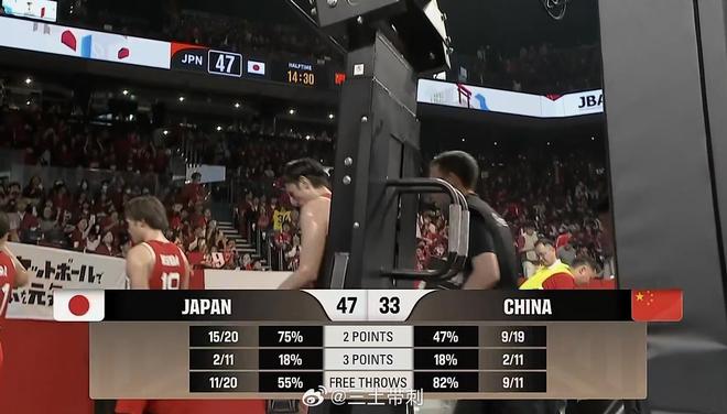 北京时间2月26日,2027年男篮世界杯亚洲区预选赛,中国男篮对阵日本男篮,半场结束,中国队33-47暂时落后日本队。