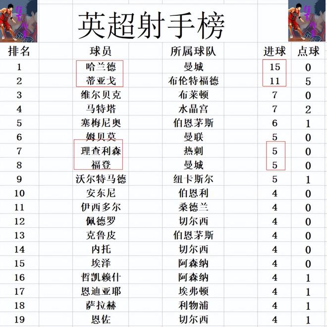 射手榜方面,哈兰德今天打入一球,15球继续高居榜首,蒂亚戈11球紧随其后位列第2。维尔贝克,马特塔7球并列第3,塞梅尼奥6球排在第5。福登近两轮连场梅开二度,2轮打入4球,追上理查利森,姆贝莫等人5球并列第6。