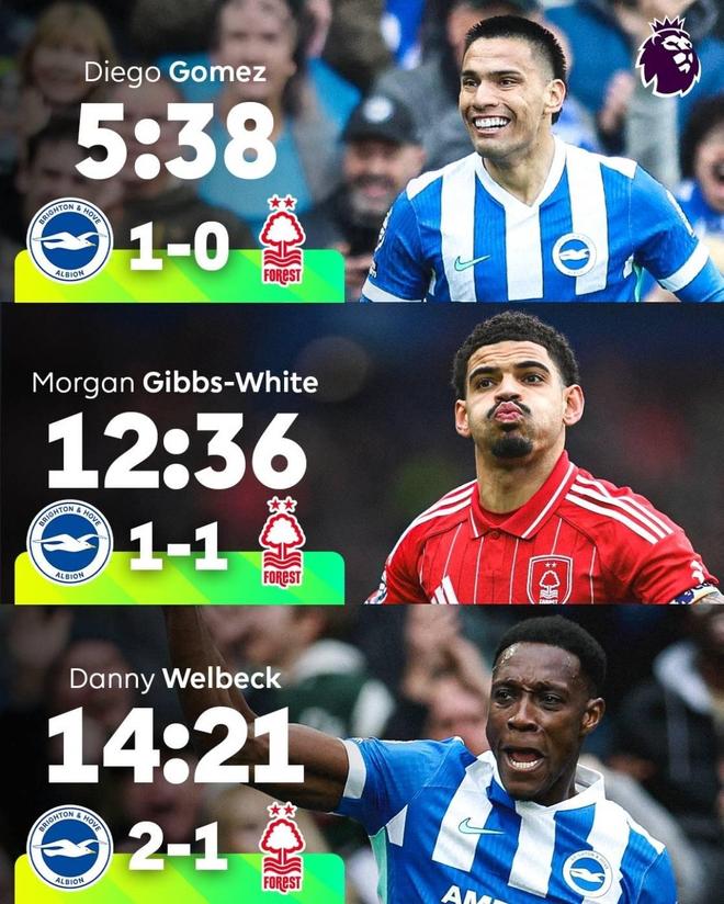 在比赛中,迭戈-戈麦斯在5分38秒为布莱顿首开纪录,吉布斯-怀特在12分36秒为森林扳平比分,而维尔贝克在14分21秒帮助布莱顿再次领先。据英超官方统计,这是本赛季英超首次出现前15分钟打入3球的情况。